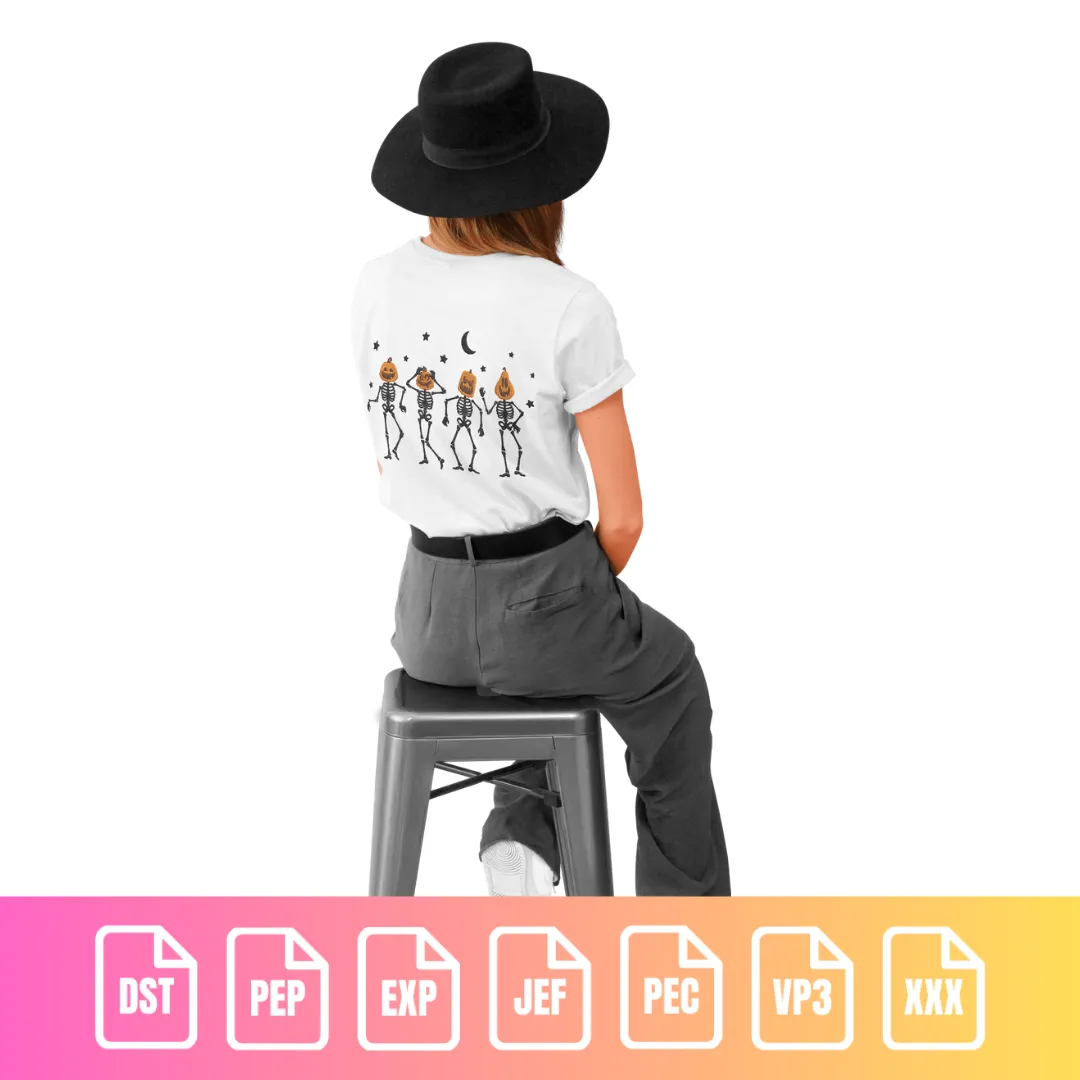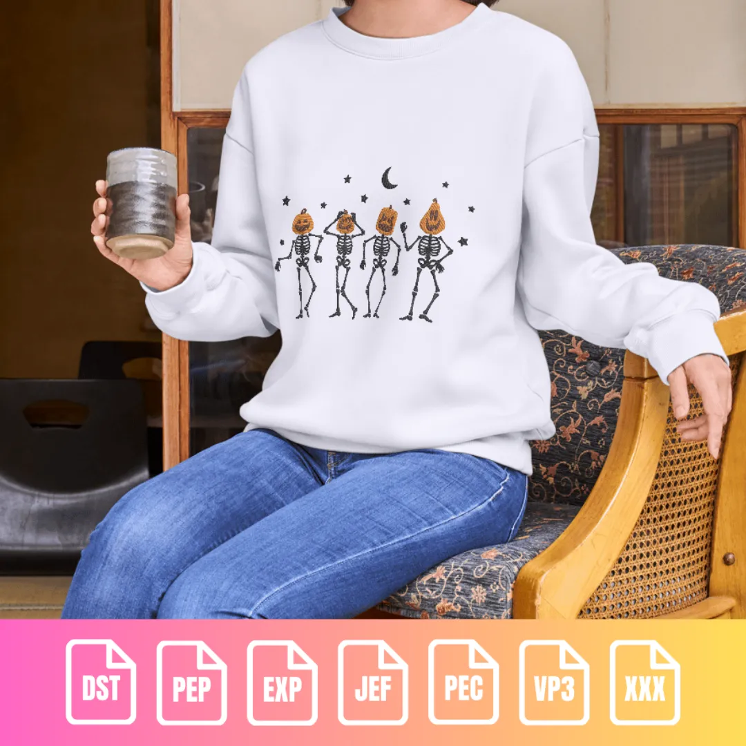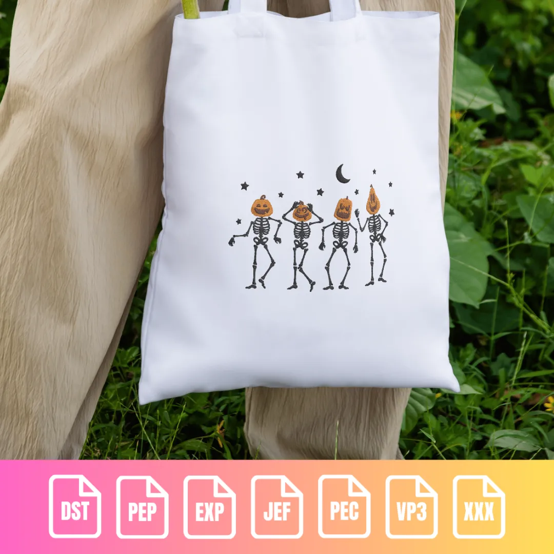 Bring spooky fun to your Halloween crafts with this lively Dancing Pumpkin Skeletons Machine Embroidery Design Pattern! This playful design features four grinning pumpkin-headed skeletons dancing under a crescent moon and twinkling stars, blending eerie charm with festive cheer. Perfect for decorating trick-or-treat bags, costumes, table runners, or home decor items like pillows and wall hangings, this unique pattern is a hit for Halloween enthusiasts. With its bold orange pumpkins and dynamic skeletal poses, this high-quality digital file adds a whimsical touch to your embroidery projects, making it ideal for seasonal gifts or party decorations that will delight kids and adults alike.
